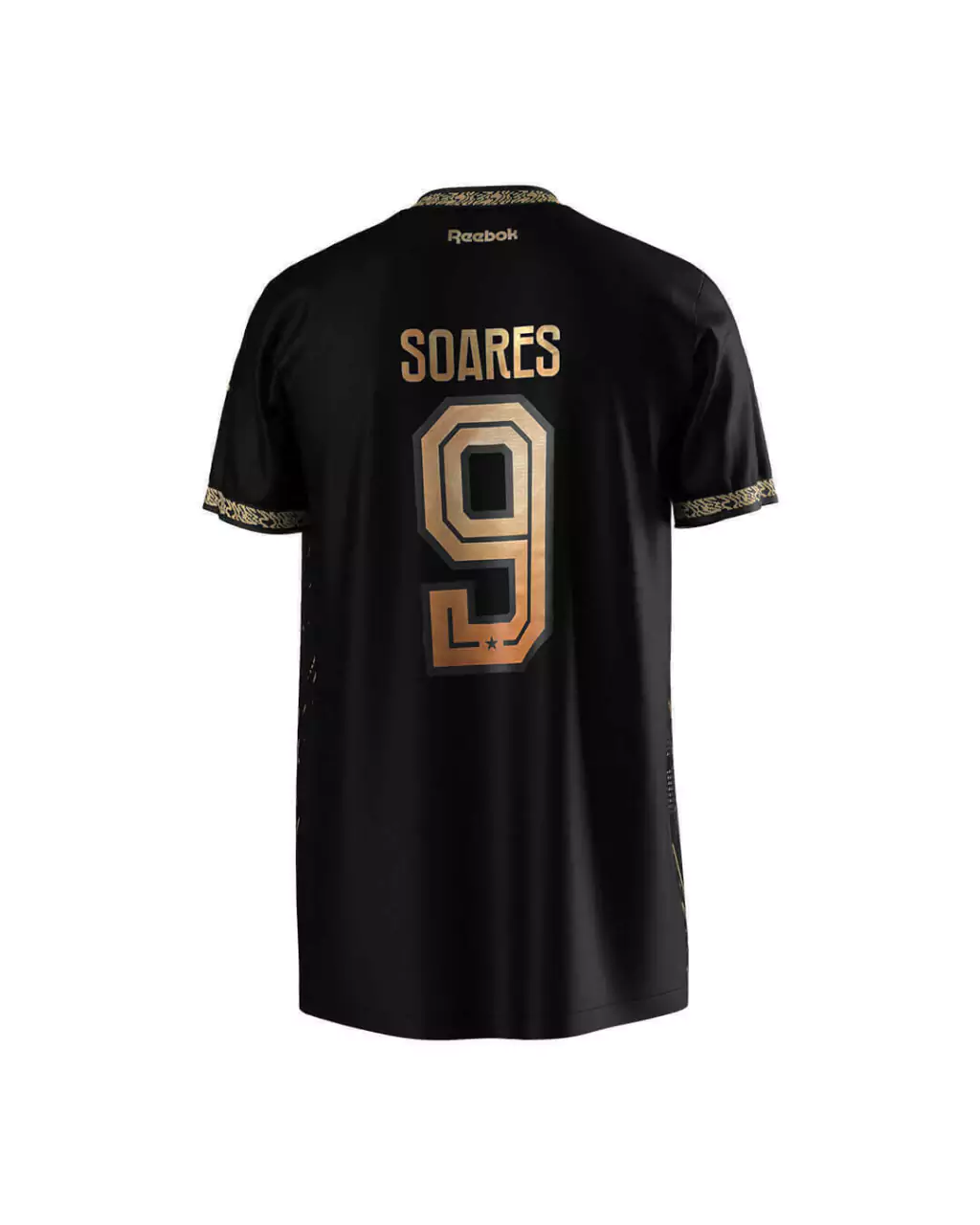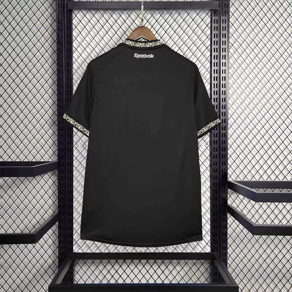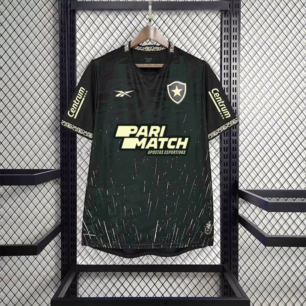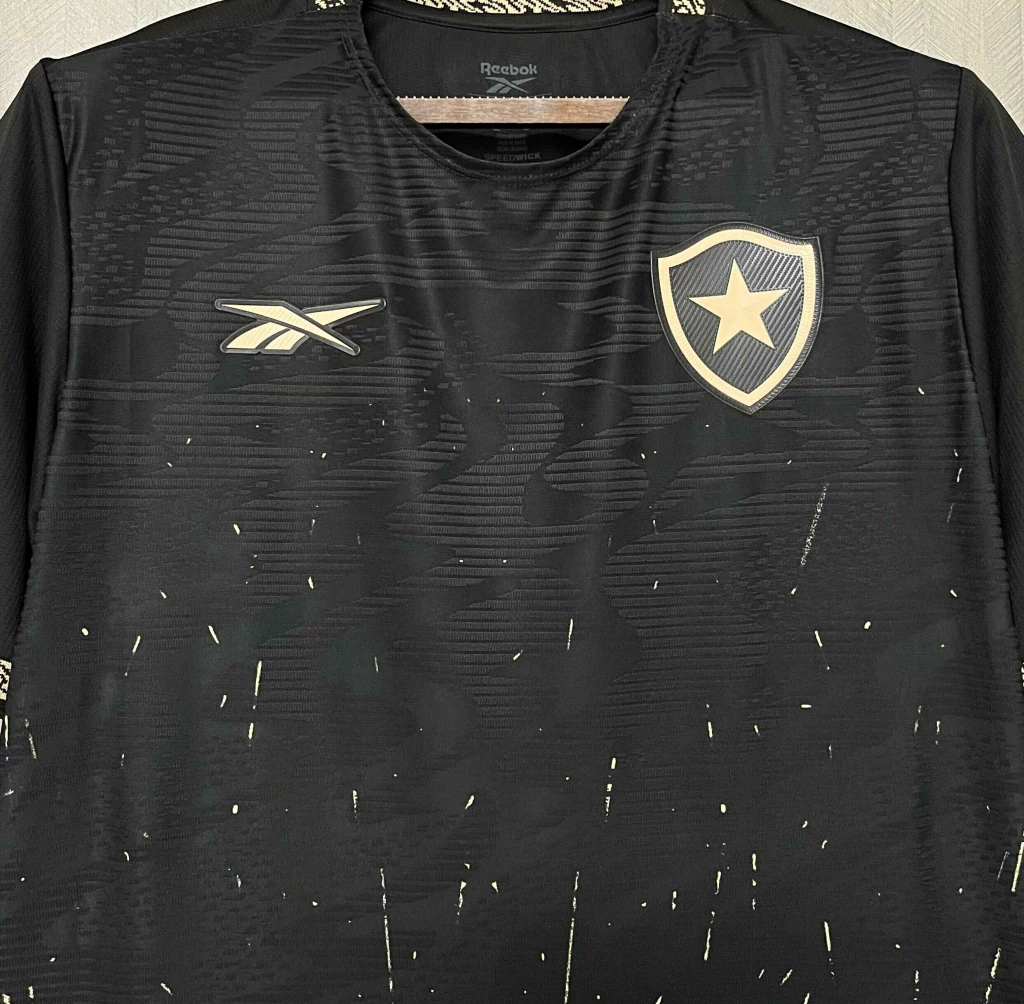 A camisa reserva do Botafogo para a temporada 24/25 tem cor predominante preta e possui grafismo com chamas na parte frontal. A gola é redonda, seu escudo é preto com bronze aplicado em vinil do lado esquerdo e a logo da Reebok do lado direito.